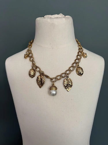 Vintage Gold Chain Link Charm Necklace 1980s - Pearl, Acorn, Leaves