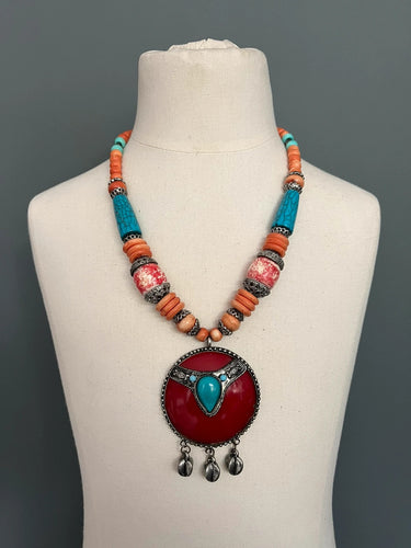 Vintage 1980s Tribal Statement Necklace - Turquoise, Silver & Red Coral